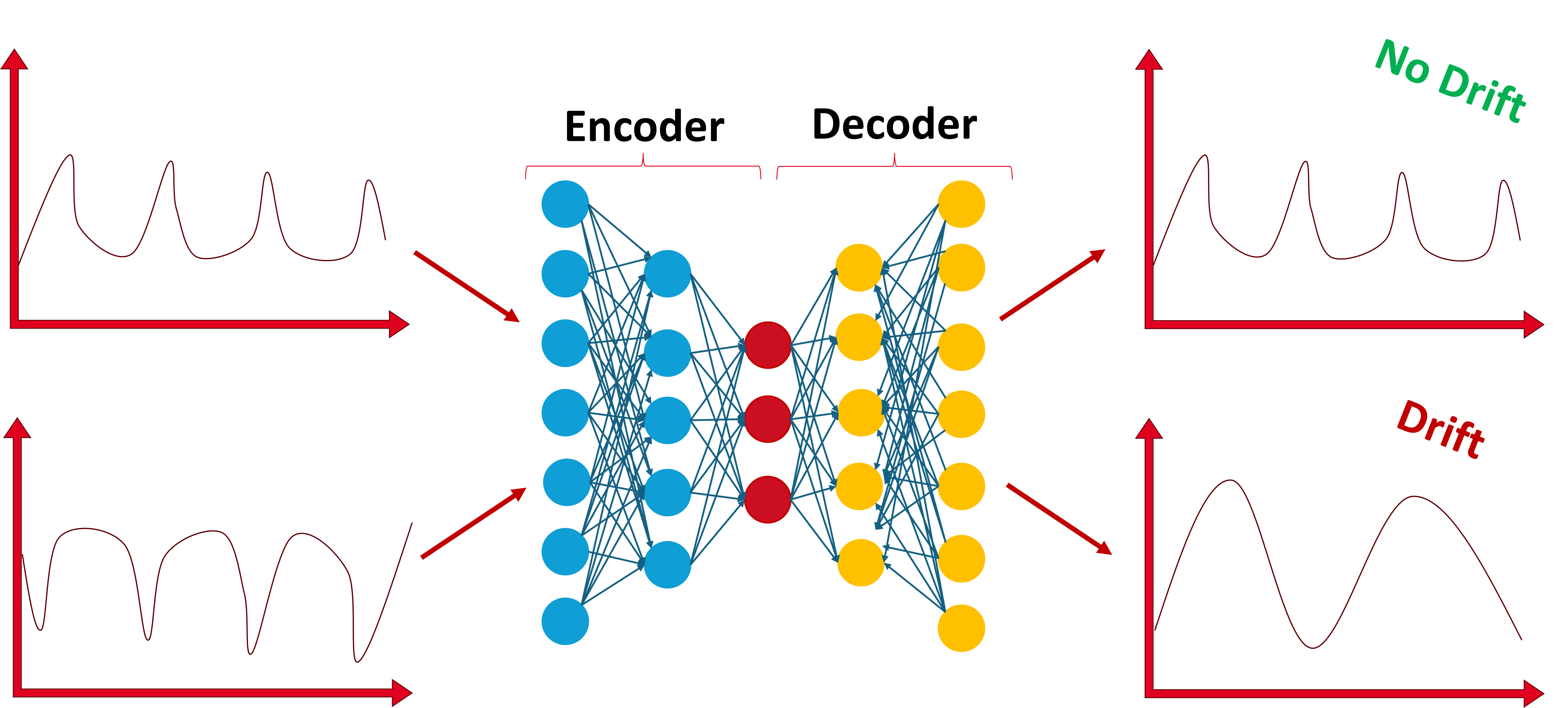 To detect this drift, we apply a commonly used technique. For this we use a type of machine learning model called the autoencoder. The autoencoder is a type of neural network whose main goal is to reconstruct its input data. It consists of two main parts. The first part is the encoder, which creates a smaller representation, called an embedding, of the input data. The second part is the decoder, which attempts to reconstruct the input data from this smaller representation. This means that when an autoencoder is trained on a certain dataset, it can accurately reconstruct data from that distribution. However, when the data distribution changes, for example the speed of the motor changes, the model will fail to reconstruct the data. This means that the difference between the input and output of the autoencoder, also called the reconstruction loss, serves as a metric for detecting drift. Using a threshold we can determine whether drift is present. If the reconstruction loss is below the threshold, no drift is detected. Otherwise, drift is present.