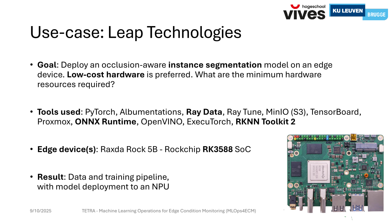 Use case: Leap Technologies Deze use case werd gepresenteerd tijdens het slotevent: Zie pagina 99 van de slides. Televic Demo: train1, train2 Gebruiker: mlops Wachtwoord: 4ecm