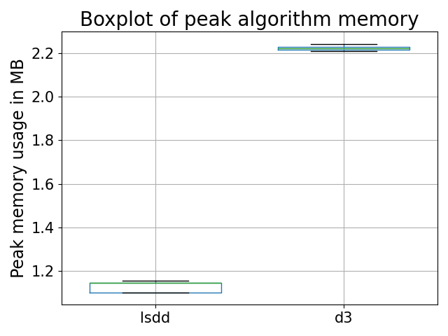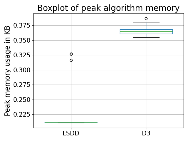 Figure 7: The peak algorithm memories for both LSDD and D3 showing a better performance for LSDD on the motor bearing dataset.