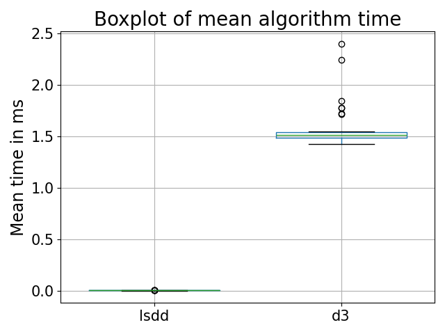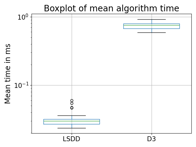 Figure 6: The mean algorithm times for both LSDD and D3 showing a better performance for LSDD on the magic marble dataset.
