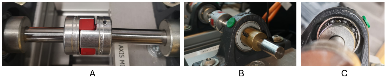 Figure 2: The different types of faults in the bearing: A) axis misalignment. B) imbalanced weight. C) faulty bearing.