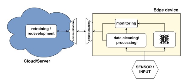 Het model wordt op het Edge device zelf geplaatst. Dit ontvangt bepaalde sensorwaarden als input die worden schoongemaakt voordat ze aan het model worden gegeven. Zowel de schoongemaakte data als de voorspellingen van het model worden gemonitord om drift te detecteren. Wanneer er drift wordt herkend, wordt de data doorgestuurd naar de Cloud. Daar kan het model opnieuw worden getraind. Het nieuwe model kan dan op het Edge device worden geplaatst. Op de Cloud worden ook de nieuwe versies van de data en het model bijgehouden.